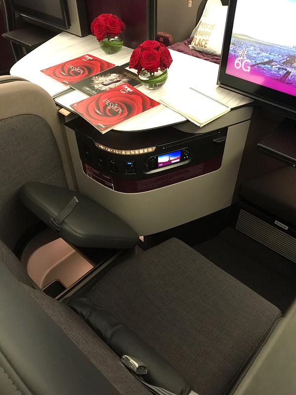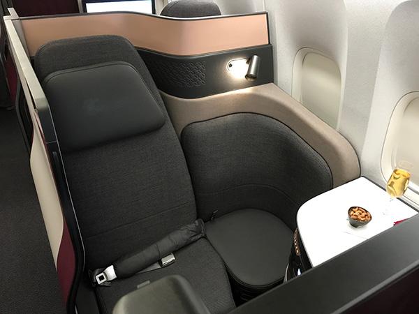 Qatar's Qsuite cabin is laid out in a 1-2-1 configuration, with seats facing both forward and aft. This is the single outboard seat; the flat area beside the seat cushion is a height-adjustable armrest.