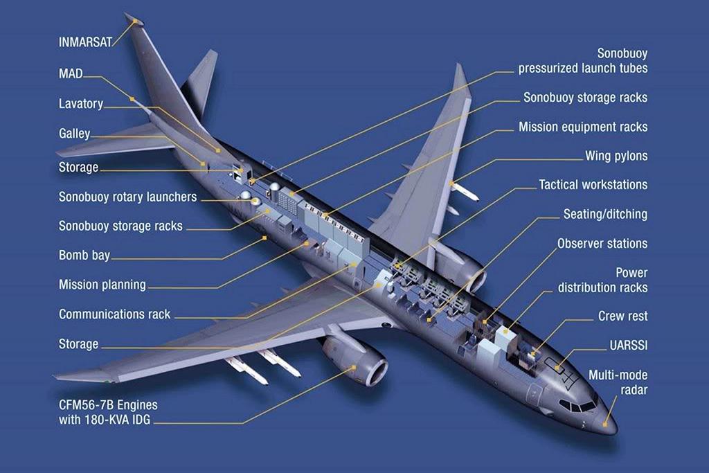 Boeing’s P-8A Poseidon is designed to carry and dispense the large and complex sonobuoy patterns associated with multistatic active coherent (MAC) acoustic processing, designed to defeat evasive tactics that submarines can use against earlier, less sophisticated air-dropped active systems. It also has a specially developed radar designed to detect periscopes.