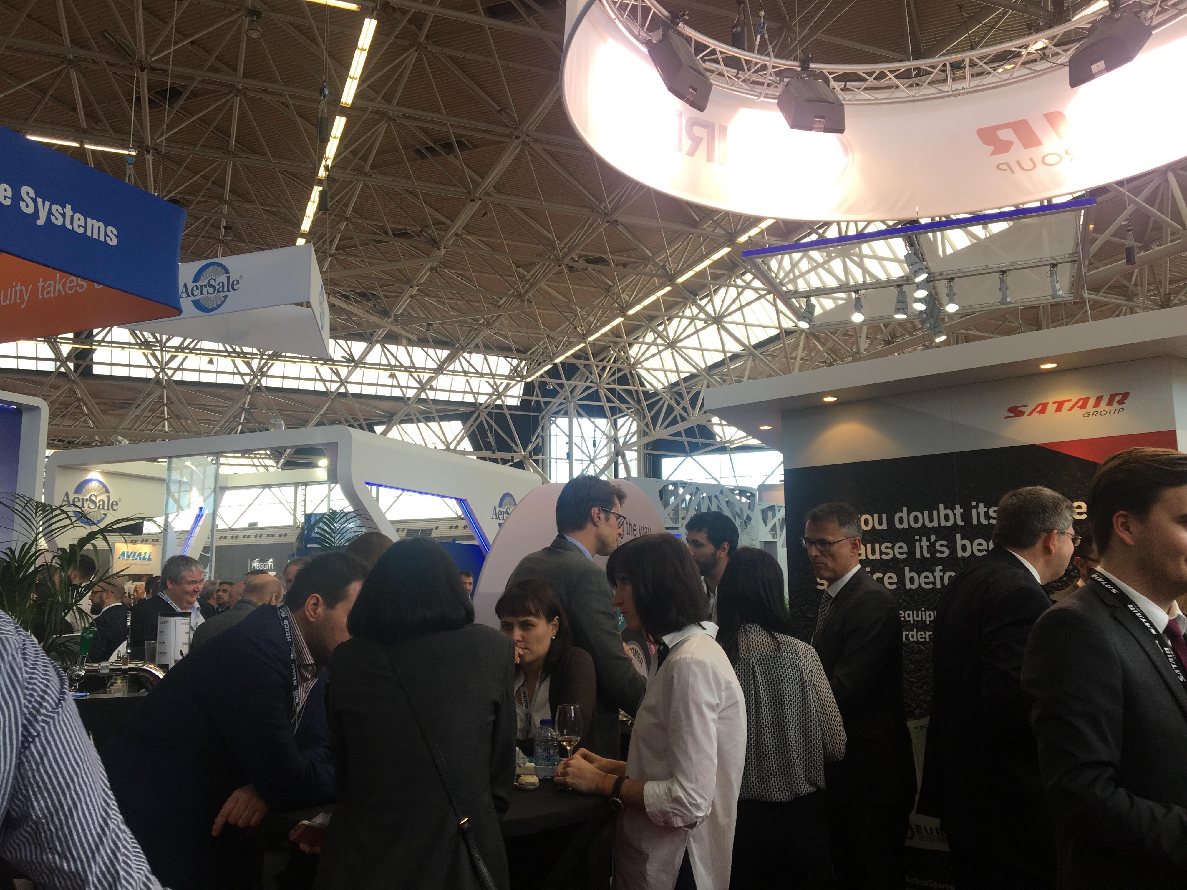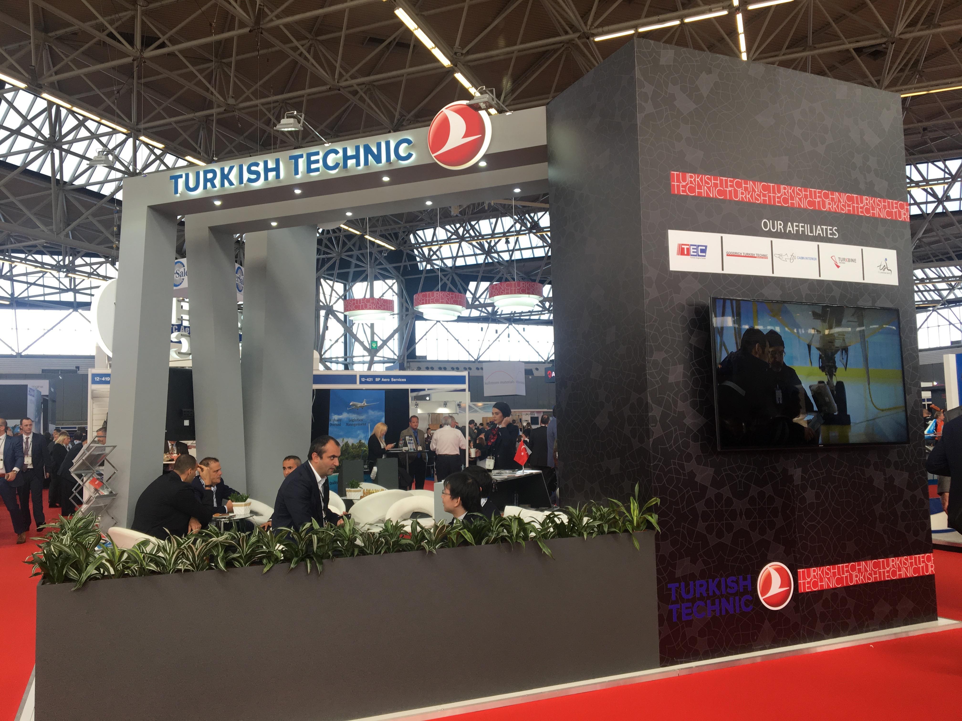 Turkish Technic (Booth 12-319) also has a reel displaying maintenance and repair operations, with a meeting space next to it.