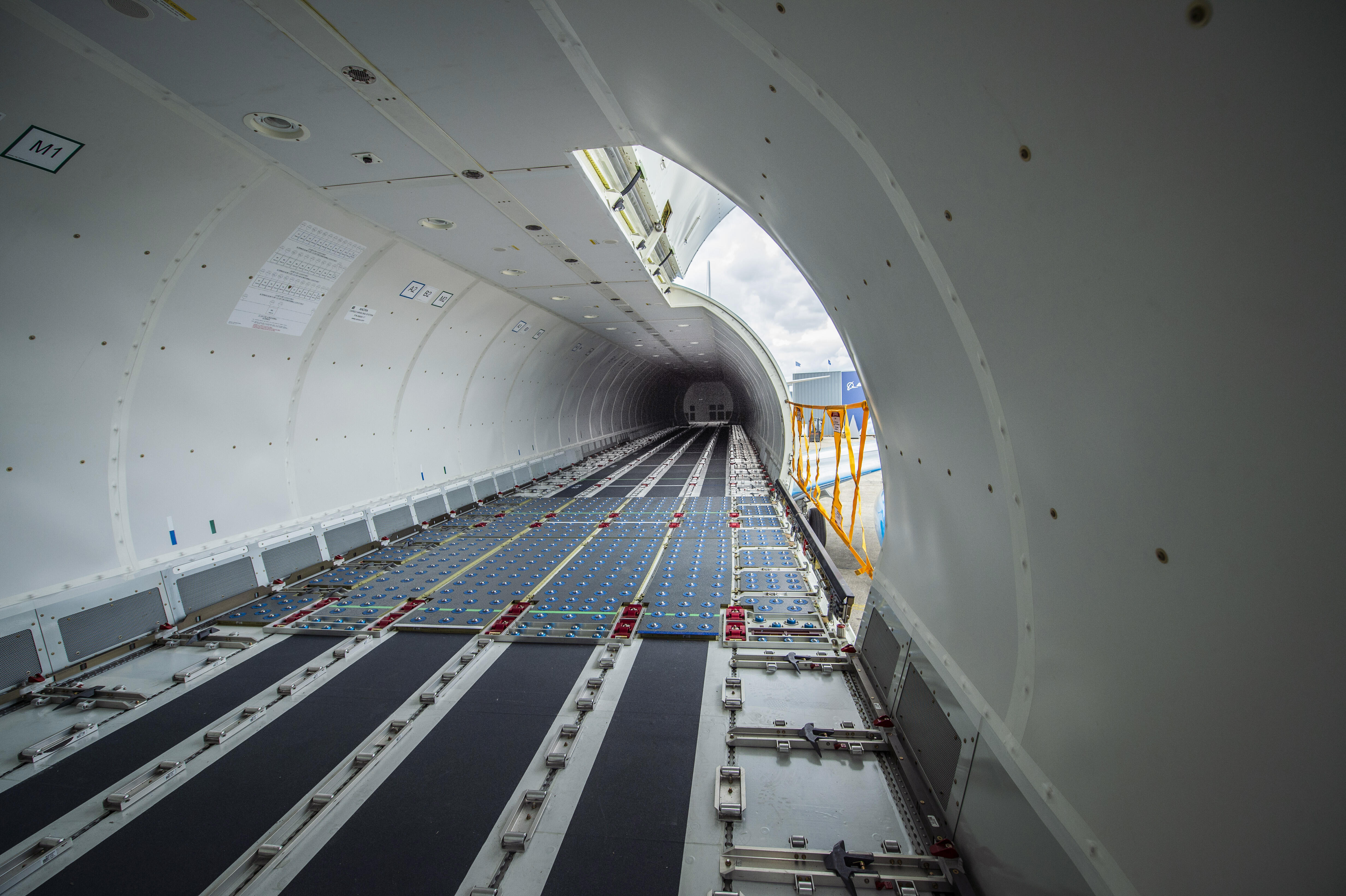 Pictured here is a Boeing-designed electrically actuated main deck cargo door, which comes standard on BCFs. It should require less maintenance than a hydraulic system.
