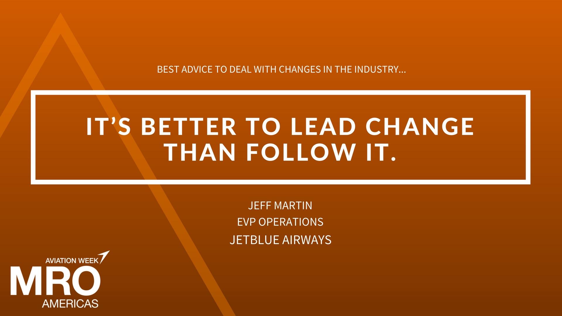 Jeff Martin, EVP operations for JetBlue, and the airline keynote speaker for "Change for Good", Apr. 26 at #MROAM