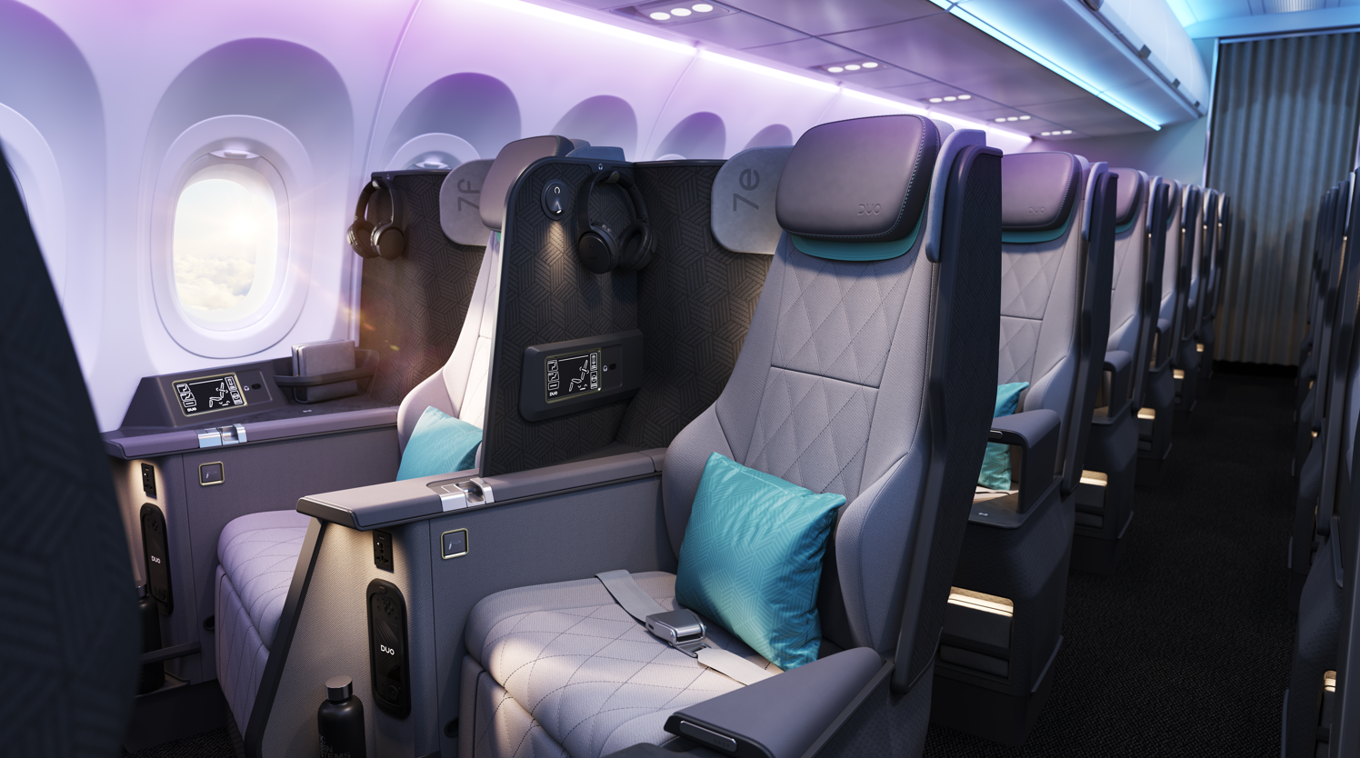 Air New Zealand unveiled its new cabin interior featuring its latest Business Premier seats, designed and manufactured with Safran Seats. Scheduled to enter in service in 2024 and retrofit their current 787-9 fleet, the concept is designed to create a “home away from home” experience. It offers two choices within the business premier cabin: Business Premier seat, which offers a comfortable and private nest for a tranquil sleep. If traveling with a companion, the middle row allows customers to open their nest and share their experience. The Business Premier Luxe is for customers looking for space and privacy. A luxury experience with all the features of Business Premier, but with a fully closing door and space for two people to dine. The herringbone configuration ensures easy aisle access and the high shells combined with adjustable aisle and center dividers contribute to privacy. Wireless charging is integrated into the seat.
