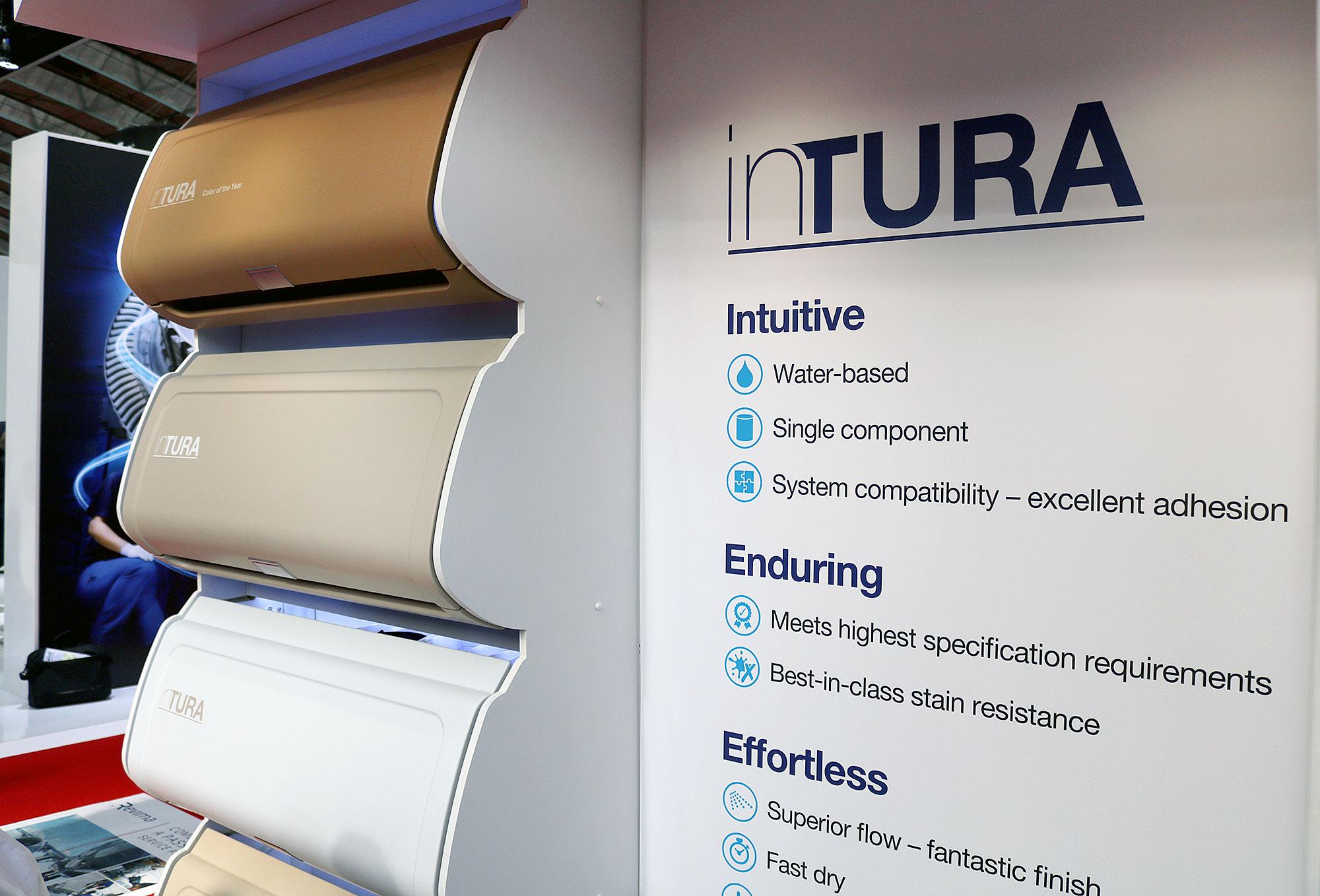 AkzoNobel showcased its new Intura interior coating system, which was launched in September 2018. Intura is a one-component, water-borne cabin topcoat that can help brand airlines with easier application and less maintenance, according to AkzoNobel. The product, which is offered in both full liquid and film systems, provides resistance to abrasions and stains as well as gloss retention. AkzoNobel says Intura can be added to any spray gun and applied to an airline’s substrate of choice without any mixing requirements. The company says Intura is a good option for easy cabin refinishing to “spruce up any tired cabin.”