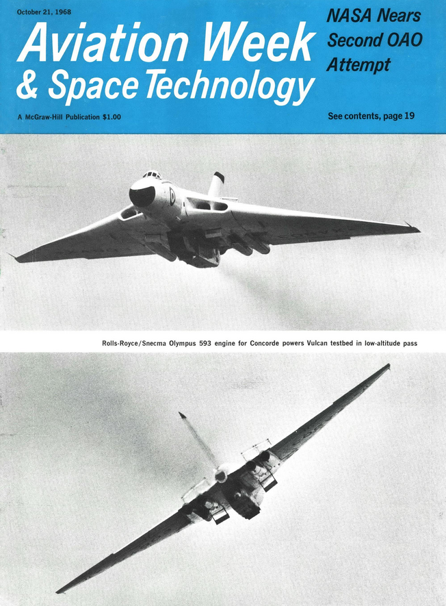 Concorde was powered by four Olympus engines, jointly built by Rolls-Royce and SNECMA, which established the footing for SNECMA to enter into civil aviation turbojet engine manufacturing. An Avro Vulcan bomber was converted into a flying testbed for the new engine and is shown on the front cover of Aviation Week with a version of the Olympus engine attached to its belly.