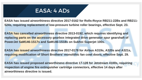A round up of airworthiness directives from Australian, European and U.S. aviation regulators.