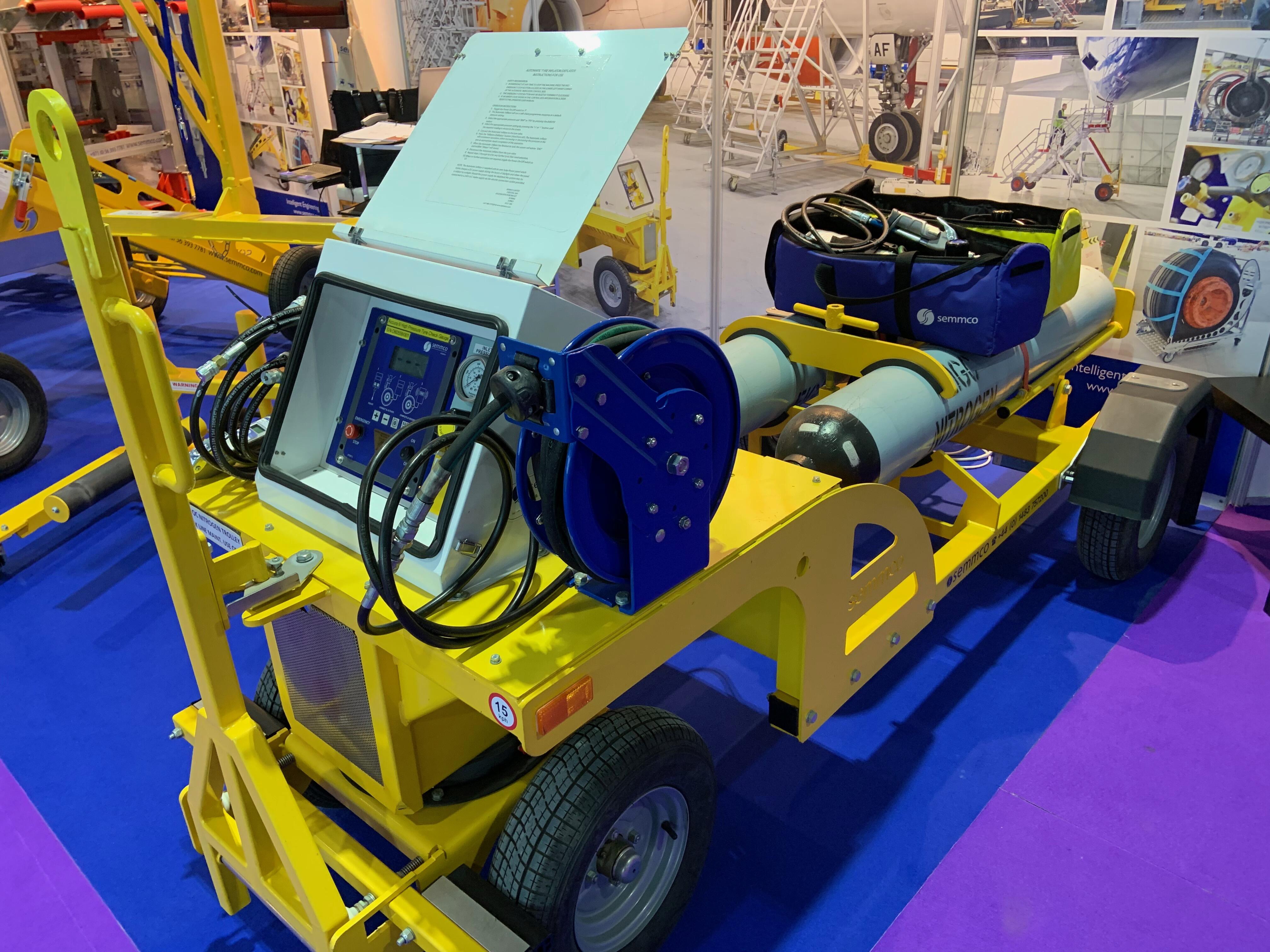 This automatic tire inflator/deflator at Semmco's exhibit is supplied with its own solar power panel.