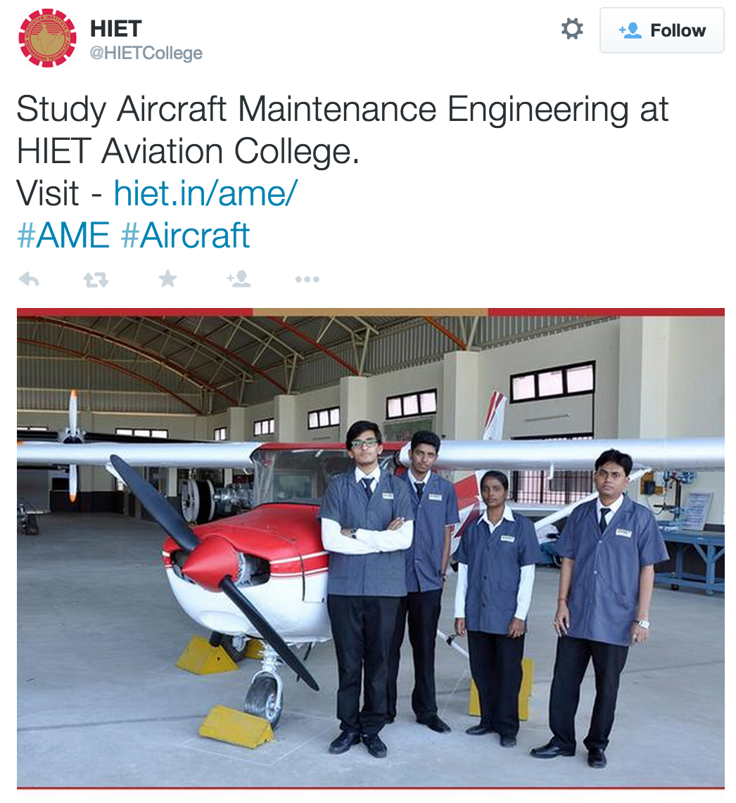 HIET college tweets a post about its aviation college including details on how the institution expanded and links to photo galleries and videos.