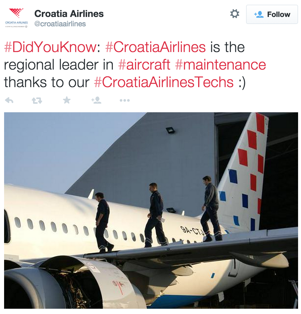 Croatia Airlines tweets a shout out to its aircraft maintenance team, Croatia Airline Techs.