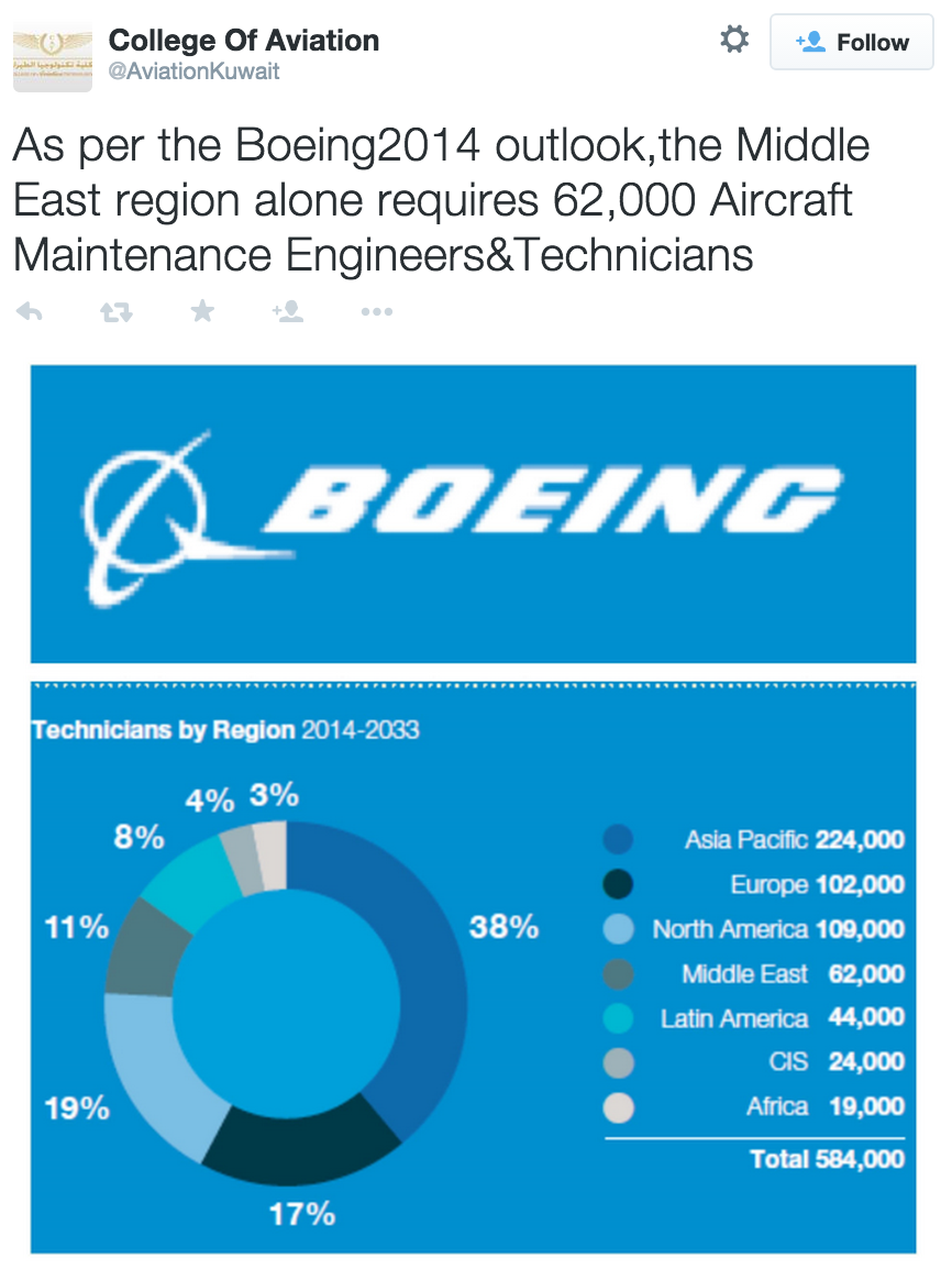 College of Aviation tweets some statistics about aircraft maintenance engineers and technicians from Boeing.