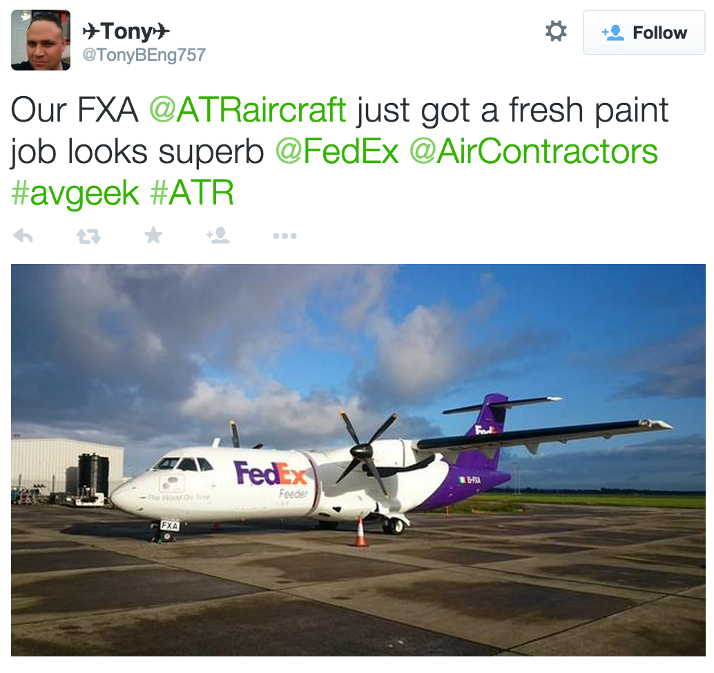 Photo of a newly painted FXA ATR aircraft with the FedEx logo.