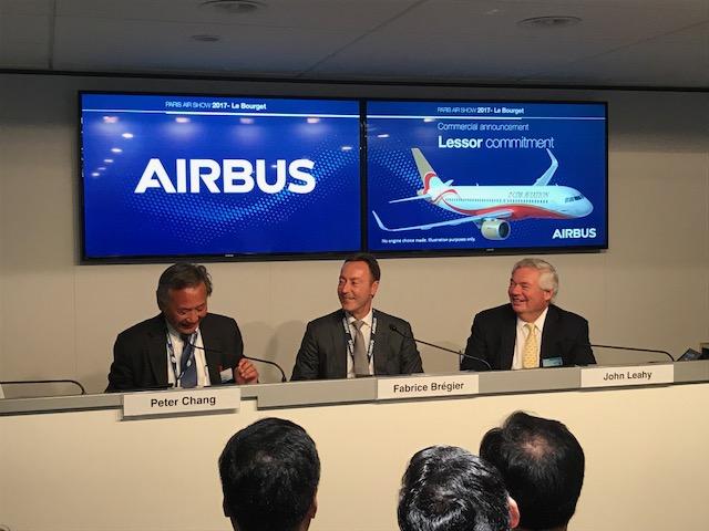 CDB Aviation CEO Peter Chang, Airbus COO Fabrice Bregier and Airbus COO-customers John Leahy at the order signing at the Paris Air Show.