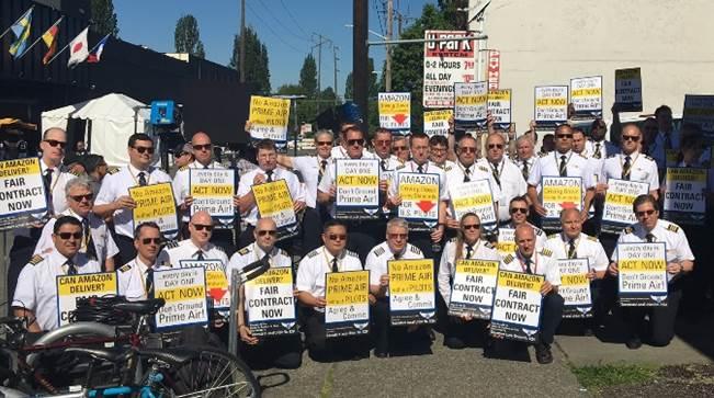 Cargo pilots who fly for Amazon Prime Air picketed at Amazon’s May 23 annual shareholder meeting in Seattle to alert investors about the intensifying challenges at their airlines and the potential risks for Amazon’s growing logistics operations.