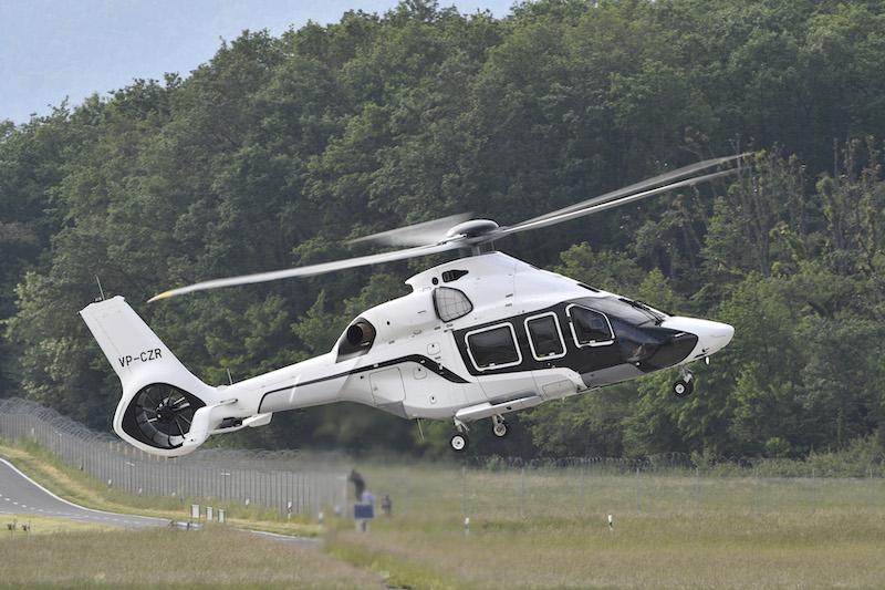 Airbus Corporate Helicopters H160 touching down to taxi into place at the static display.