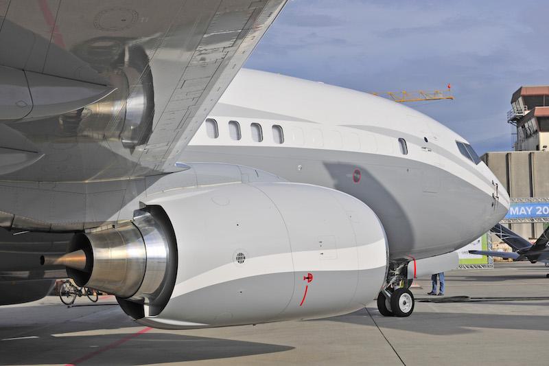 The CFM International CFM56-7B engine, made by the GE Aerospace and Safran joint venture, powers this Boeing Business Jet (BBJ1), based on a combination of the 737-700 fuselage and the wing of the larger 737-800.