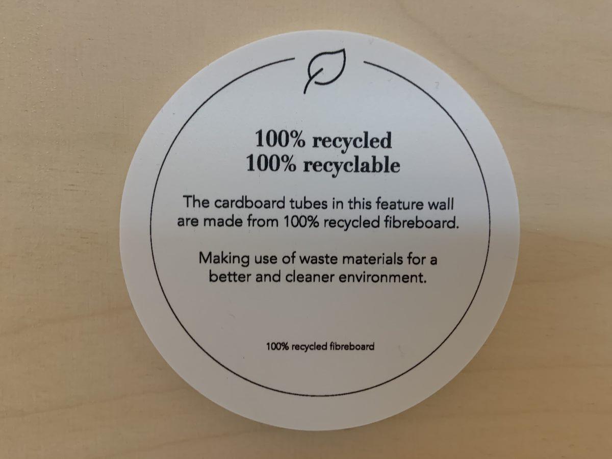 The Bombardier booth (Z117) appears to have a church organ installed, but it is, in fact a decorative wall feature comprising multiple cardboard tubes—wholly recycled and wholly recyclable, as the adjacent plaque attests. Credit: Aviation Week/Lee Ann Shay
