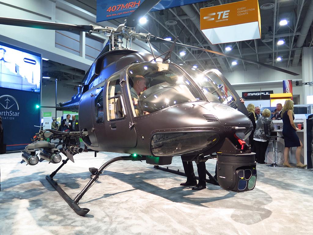 On any given day around the world, a Bell 407GX commercial helicopter is likely shuttling corporate bosses, electricity-grid inspectors or emergency responders. In conflict zones, however, the helicopters are being used to attack insurgents, destroy tanks with Hellfire missiles and provide armed reconnaissance to support ground troops. It is in those missions that NorthStar Aviation says its militarized 407GX Multirole Light Attack Helicopter (MRH) excels, and it wants the U.S. Army, Special Operations Forces and potential foreign buyers to consider it. The company says it has delivered “at least 25” of a 30-aircraft order to the United Arab Emirates(UAE), its 407MRH launch customer, on top of the 15 unarmed Bell 407s it sent to Dubai to support flight training. The company brought its display model along to AUSA, outfitted with standard armaments on a four-station Cantine weapons platform: twin AGM-114 Hellfire anti-tank missiles, a seven-shot M260 rocket pod for firing 2.75-in. Hydra rockets and two gun options—the 0.30-caliber M134 minigun (3,000 rounds) and 0.50-caliber GAU-19 heavy machine gun (500 rounds). Added features include Garmin G1000H avionics, a fully integrated mission and weapons management systems and a Flir 260HLD electro-optical/infrared turret as well as lightweight carbon-fiber doors and a driveshaft cover with antenna mounts. NorthStar competes for orders directly with prime manufacturers such as Bell—which supplied Iraq’s IA-407 armed scout aircraft. NorthStar says the 407MRH costs up to four times less than a traditional gunship and asserts that it can convert new and existing rotorcraft more quickly and cheaply than OEMs while maintaining the fully airworthiness and warranty of the platforms. It is in discussions with many interested parties, but firm orders remain elusive.