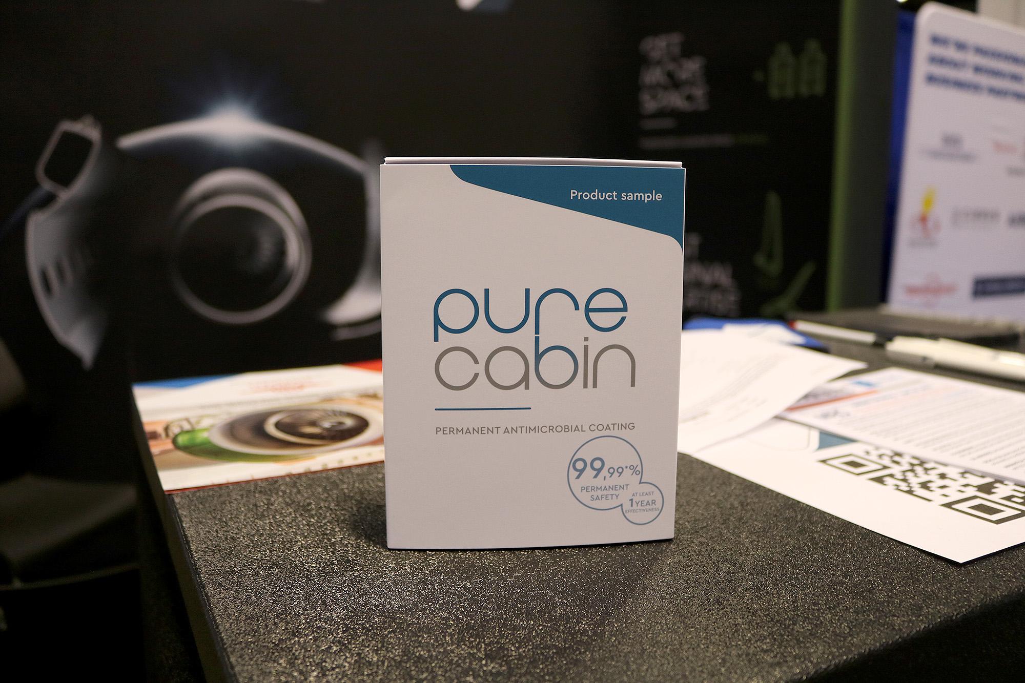 FACC is displaying product samples of its new Pure Cabin antimicrobial surface coating for aircraft cabins. It says the permanent photocatalytic surface solution can free surfaces from all types of viruses, bacteria and fungi without being toxic or biocide-based. It can be applied to all materials, including laminate, leather, metal, injection molding or fabric and FACC says it eliminates microbes within 10 mins. of application, with results lasting for up to a year.