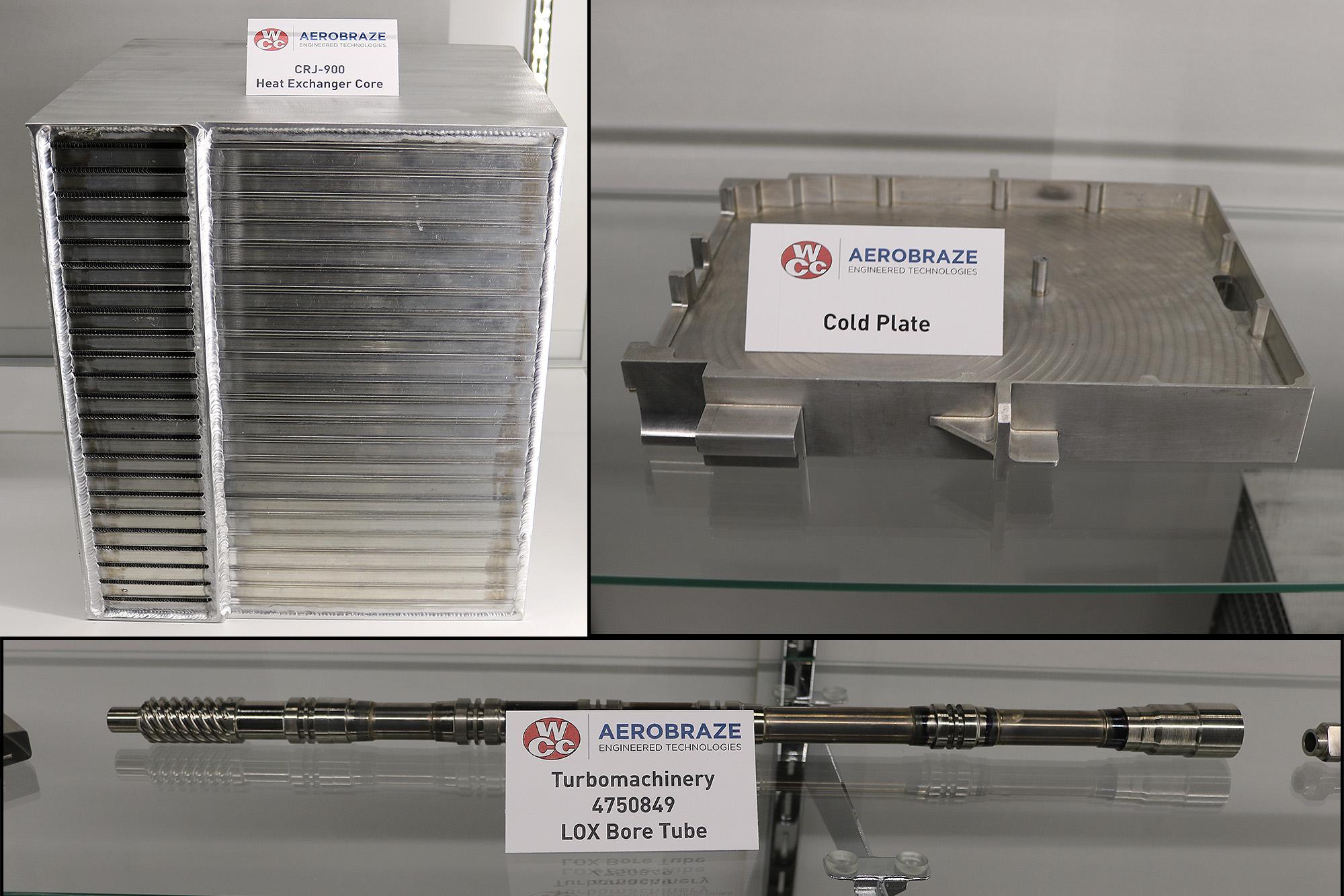 Component manufacturer Wall Colmonoy is displaying several new products, including a CRJ-900 heat exchanger core used in the aircraft environmental control system to provide cooling to the cabin, a Turbomachinery LOX Bore Tube used in a high pressure turbo pump, and a Cold Plate used to cool electronic components in radar systems for military aircraft such as the F-16 and F-35.