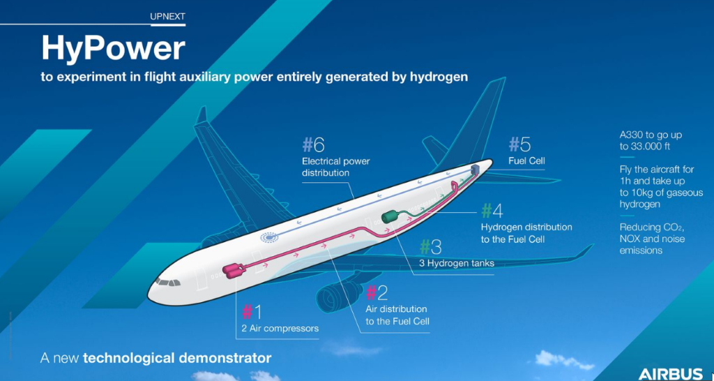 Airbus UpNext launched a new demonstrator program to explore, on the ground and in flight, a new architecture for the generation of non-propulsive energy through the use of hydrogen fuel cells. With this new technology demonstrator, led from its facilities in Spain, Airbus UpNext will replace the actual APU of an A330 with a hydrogen fuel cell system that will generate electricity. Known as HyPower, the hydrogen fuel cell demonstrator also aims to reduce the emissions of CO2, nitrogen oxides (NOx) and noise levels associated with a traditional APU. New design features and integration techniques will also contribute to maturing the safety and operations of future hydrogen-powered aircraft and will demonstrate the stable operation of a fuel cell in-flight, including its restart.